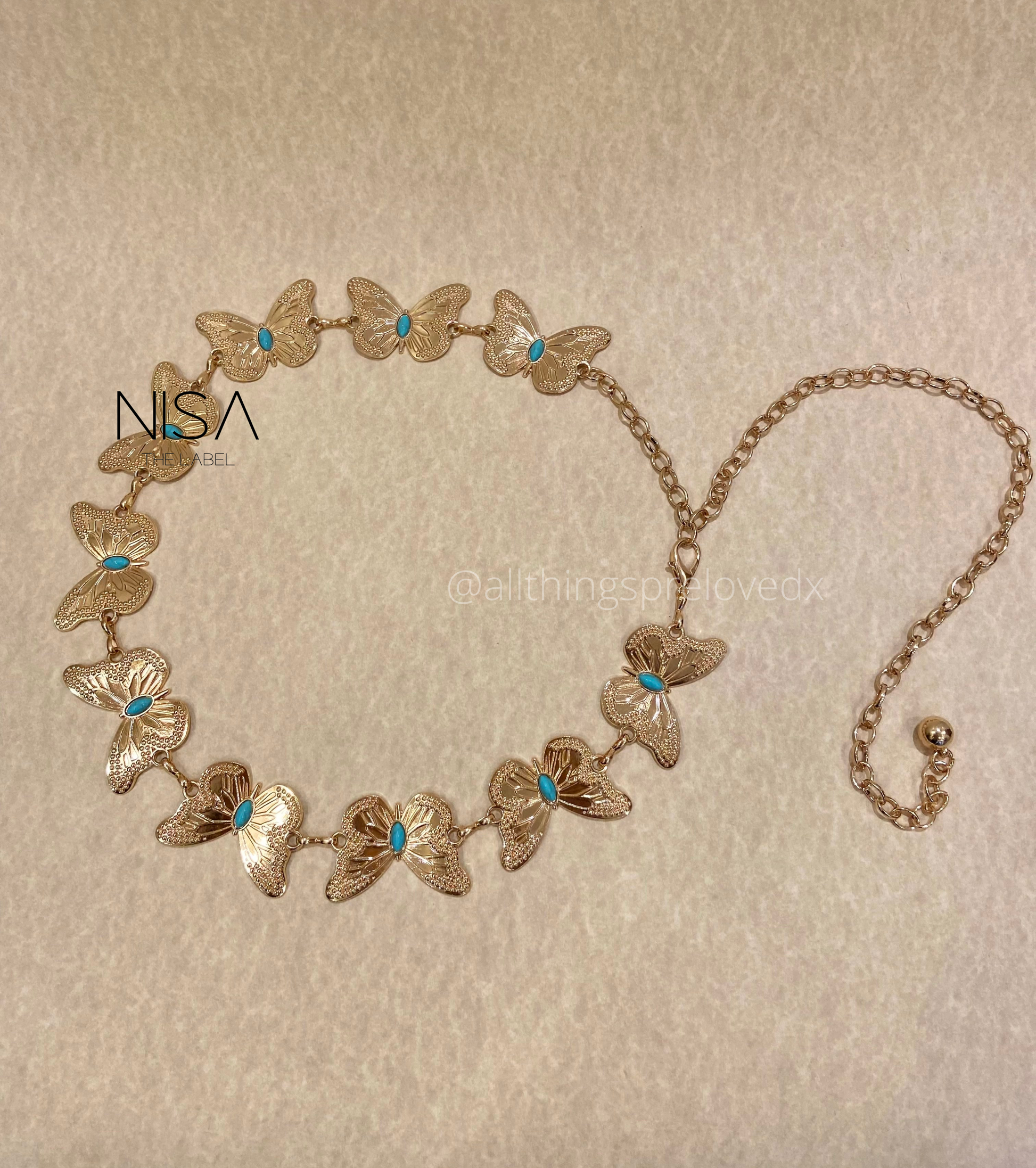 Transform your outfit into a masterpiece with our exquisite Mercury butterfly waist belt. Crafted from detailed turquoise metal chains, this luxurious accessory adds a touch of elegance and sophistication to any look. Elevate your fashion game with this stunning piece that will surely turn heads.