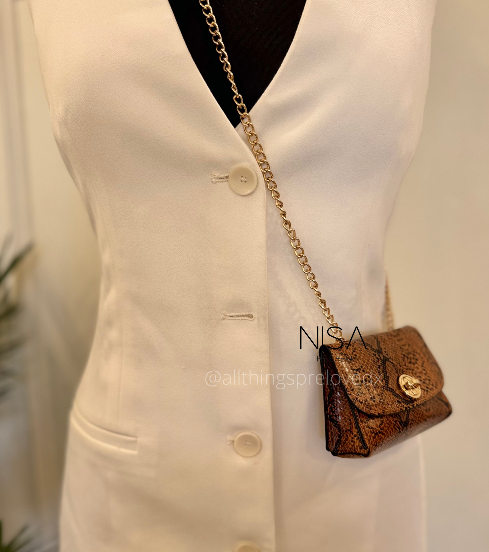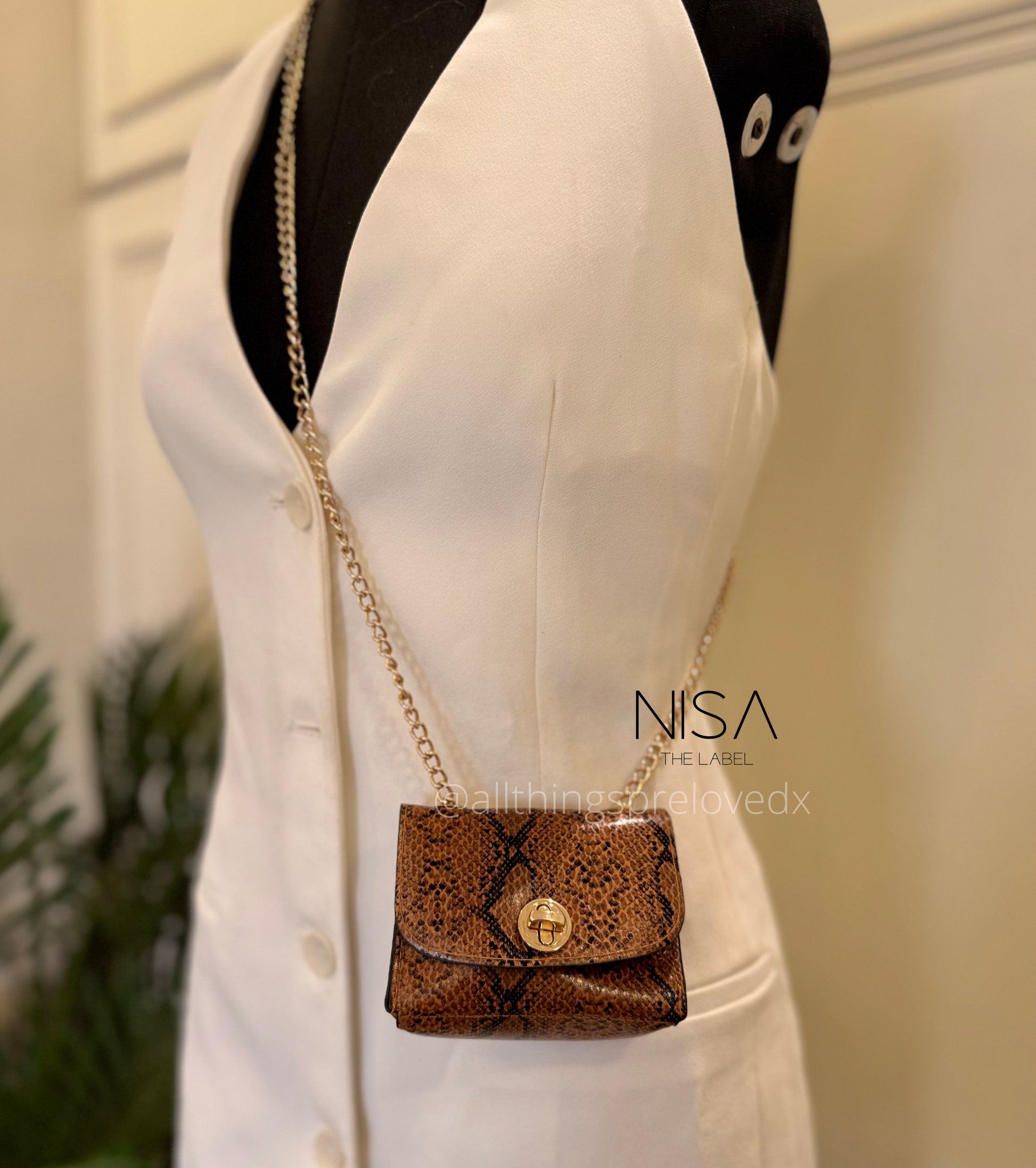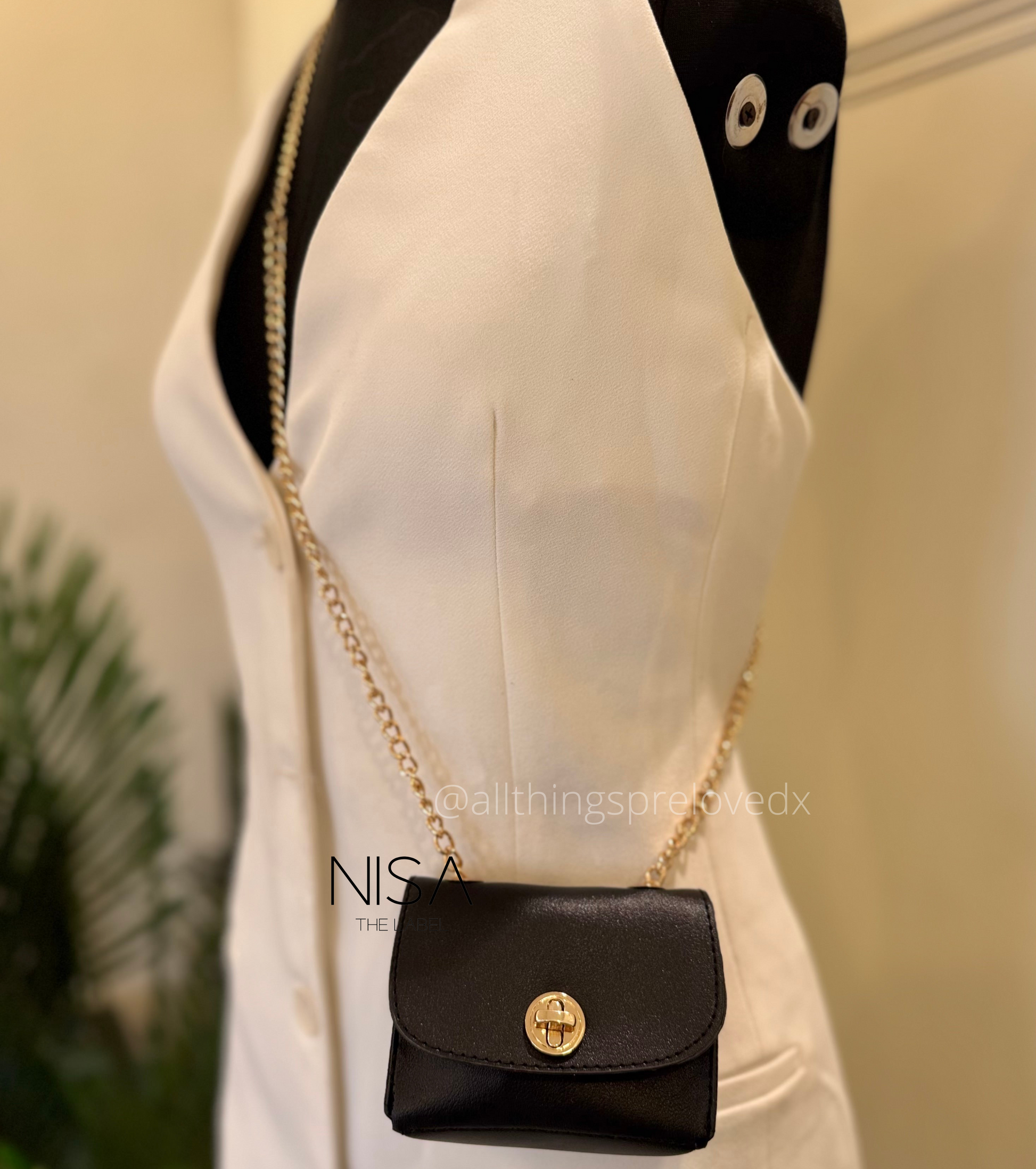 Elevate your ensemble with this sophisticated sling micro bag featuring a sleek metal chain. Its compact design offers a refined way to carry essentials while the polished chain adds a touch of modern elegance, making it perfect for both day and evening occasions.