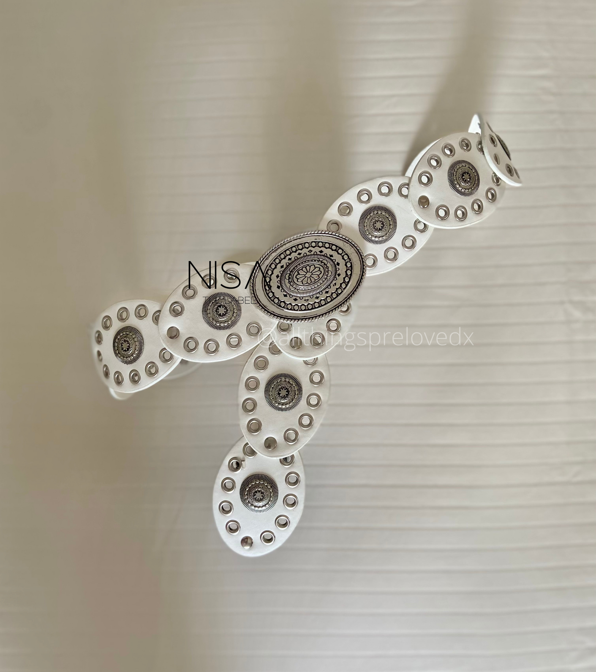 Wrap your waist in luxury with our Vintage oval buckle shield disc open work waist belt. The intricate detailing of the oval buckle adds elegance to any outfit. Made for the sophisticated and exclusive, this belt exudes style and class. Elevate your fashion game with this timeless piece.
